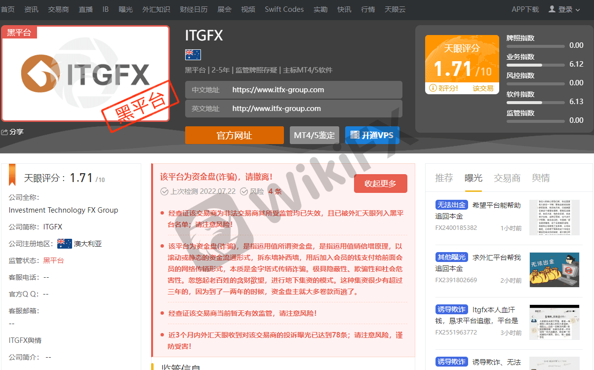 而通过外汇天眼查问ITGFX曾经被明晰标注为【黑平台】,属于是名副实在的资金盘,近3个月表里汇天眼收到对该业务商的投诉曝光已抵达78条,天眼评分仅为1.71分。
