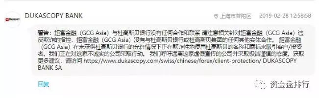 咱们先来看下GCG ASIA钜富金融说的贸易对接瑞士最大的外汇整理商杜高斯贝银行(DUKASCOPY BANK)所发的声明(如下图)