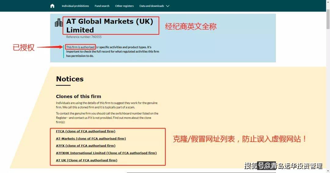 4、点开寻求结果当中的经纪商名称后,会进入该经纪商的周到页面。FCA将克隆/假意网站做了周到列外,而且正在页面的最顶部做展现,这是为了防范虚伪公司恶意利用正道经纪商名称和拘押号冒名行骗,同时提示投资者认准正道经纪商官方网址,切勿大意。