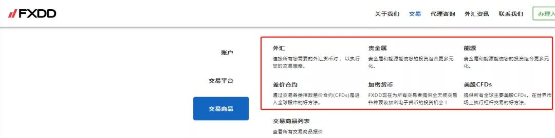 FXDD生意产物有外汇、贵金属、能源、差价合约、加密钱币和美指CFDs,完全可商讨客服。截图如下: