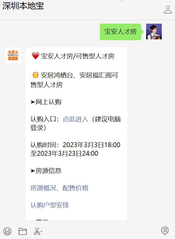 温馨提示:微信查找大众号【深圳当地宝】,合心后正在对话框回答【宝安人才房】可获深圳宝安区人才房最新房源地点/数目/价值、认购央浼、认购入口、线上看房入口等实质!