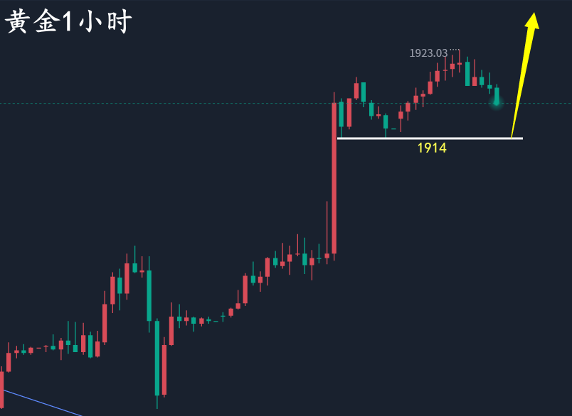 今日早间黄金开盘延续反弹,碎阳上升小幅破高1920,午后最高达到1923回落,不过欧盘回撤的幅度有限,晚间黄金延续看众或将走探底回升。盘绕1914—1915众,分水岭1910,目的上看1927—1930;达到1930一线压力可反手空一次。