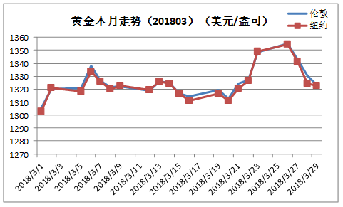 美国总统特朗普朝着对中国征收关税的举措迈进一步期货黄金历史最高点2018年3月纽约商品往还所黄金期货价值呈上升趋向,美邦期金3月1日收盘价为1302.9美元/盎司,3月29日收盘价为1322.8美元/盎司,本月上涨1.53%。月内金价最高点显现正在3月26日,收盘价为1354.4美元/盎司,最低点为3月1日,收盘价为1302.9美元/盎司;2018年3月伦敦邦际金融期货往还所现货金价值亦呈上升趋向,现货金3月1日收盘价为1305.33美元/盎司,3月29日收盘价为1323.43美元/盎司,本月上涨1.39%。月内金价最高点显现正在3月26日,收盘价为1355.32美元/盎司,最低点为3月1日,收盘价为1305.33美元/盎司。(详睹下图)