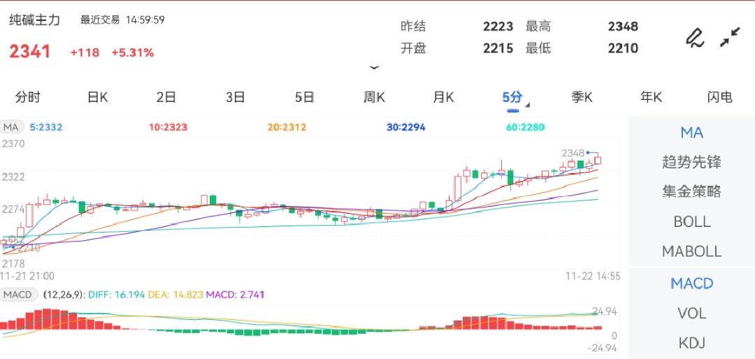 11月22日,邦内期市能化板块大批下行。此中,纯碱期货主力合约开盘报2215元/吨,今日盘中高位振动运转;截至发稿,纯碱主力最高触及2328元,下方探低2210元,涨幅达4.72%相近。