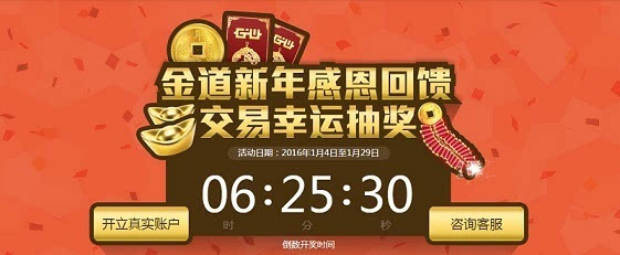 金道贵金属正在2016岁首推出的“新年派红包”营谋,秉持三大规矩,让投资者正在新年开兴奋心赢取奖金:①人人有,开户即送,100%中奖。分别于小概率抽奖营谋,金道贵金属本次营谋悉力于让每位投资者都能领到“好彩头”,正在新的一年开启投资新气候。②大红包,$100-$1000随机送。比拟于行业内最高送$200的近况,金道贵金属率先推出$1000的大红包,使每个投资者都有机缘继承大奖的照顾,为投资添加了不少刺激感。③天天有,一个月一连送连续。本次营谋时长一个月,且每天都有中奖名额,是实至名归的业界良心。