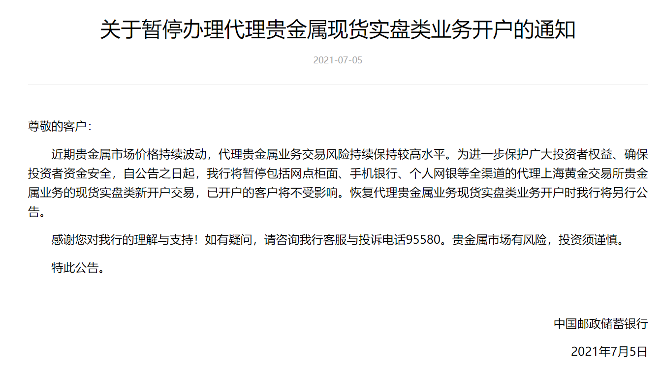 3月此后已有招商银行、工商银行、浦发银行、兴业银行、北京农商行等众家银行先后颁发贵金属营业调节通告,对贵金属营业的限定设施包含调节危险等第、生意出发点、持仓限额、暂停开仓生意、会合解约等。