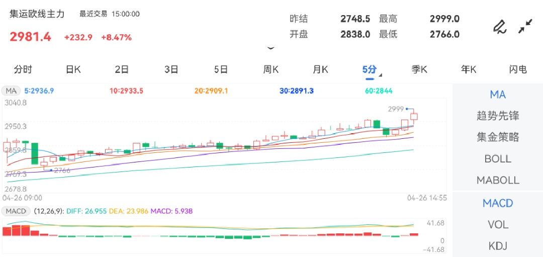 金投网APP行情中央数据显示,截止2024年4月26日下昼15:00收盘,集运指数(欧线)期货主力合约行情音讯:最新价:2981.4,涨跌:232.9,涨跌幅:8.47%,成交量:46690.0手,开盘价:2838.00,昨收价:2815.00,最高价:2999.0,最低价:2766.0。
