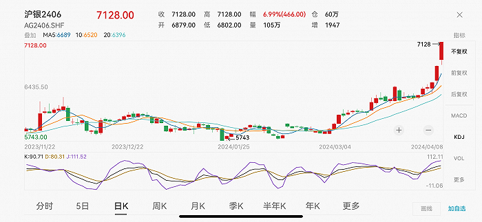 受黄金价钱节节攀升的影响,白银也显示出大涨的势头。邦内市集方面,沪银主力合约2406涨停,报收7128元/千克,涨幅6.99%,创2012年11月往后新高。现货方面,白银价钱日内击破28美元/盎司闭口,改善了近三年来最高位。岁首至今,现货白银价钱已累计上涨胜过16%。