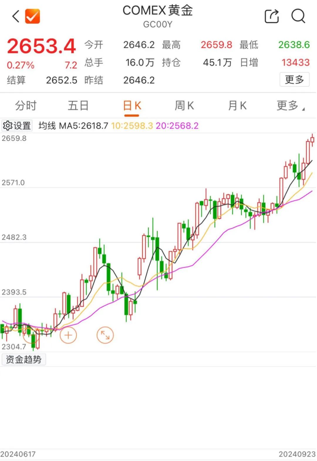 黄金现货代价、期货代价再创史乘新高。伦敦金现(现货黄金)最攀援升至2636.74美元/盎司,COMEX黄金期价23日涨至2659.8美元/盎司新高。当下,更众邦表里对冲基金估计,金价冲至3000美元/盎司大合仅是时刻题目。