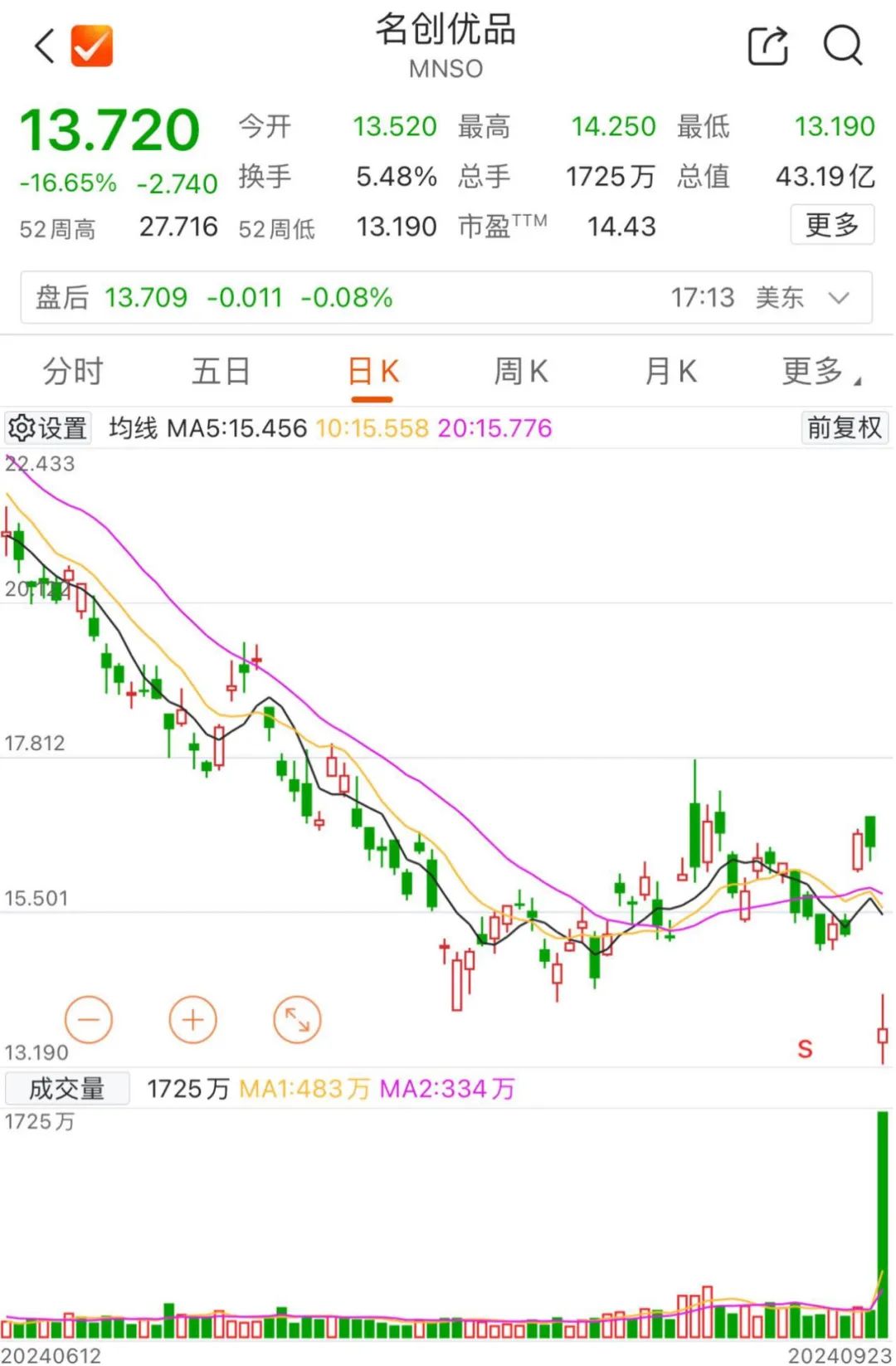 外地时刻9月23日美股盘前,名创优品一度跌超19%,截至当日收盘,该公司股价一度跌至13.19美元/股,距年内高点跌去近一半,最终大幅收跌逾16%。
