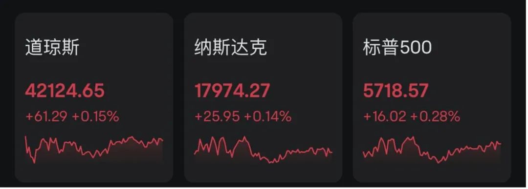 美联储降息给商场带来的“余温”还正在陆续。外地时刻周一,美股三大指数全体收涨,个中道指创收盘史乘新高。截至收盘,道指涨61.29点,涨幅0.15%,报42124.65点;标普500指数涨16.02点,涨幅0.28%,报5718.57点;纳指涨25.95点,涨幅0.14%,报17974.27点。