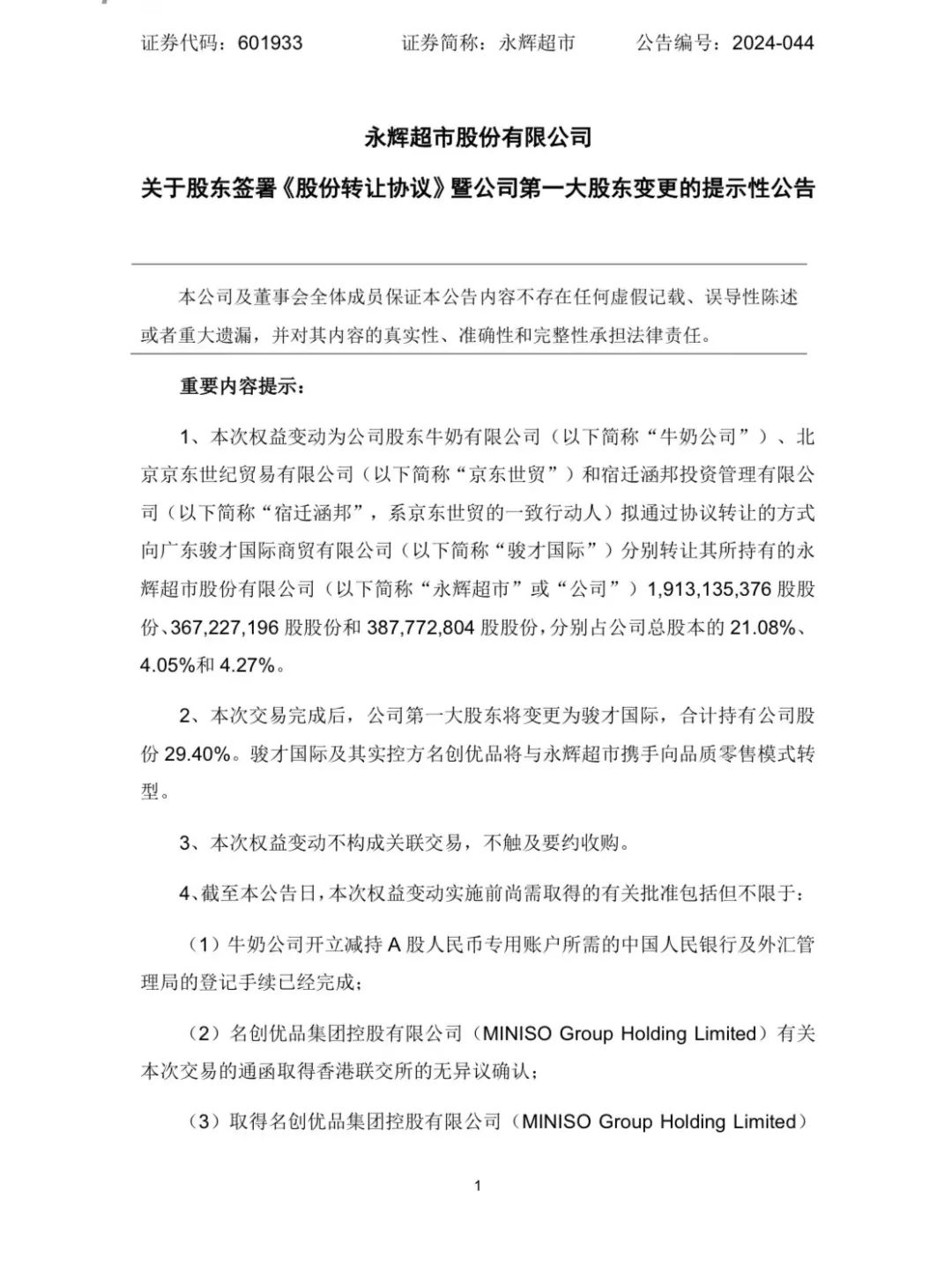 9月23日晚间,永辉超市发表告示称,公司三名股东拟向骏才邦际合计让渡公司29.40%股份。让渡完结后,永辉超市第一大股东将改换为骏才邦际,骏才邦际及实在控方名创优品将与永辉超市联袂向品格零售形式转型。
