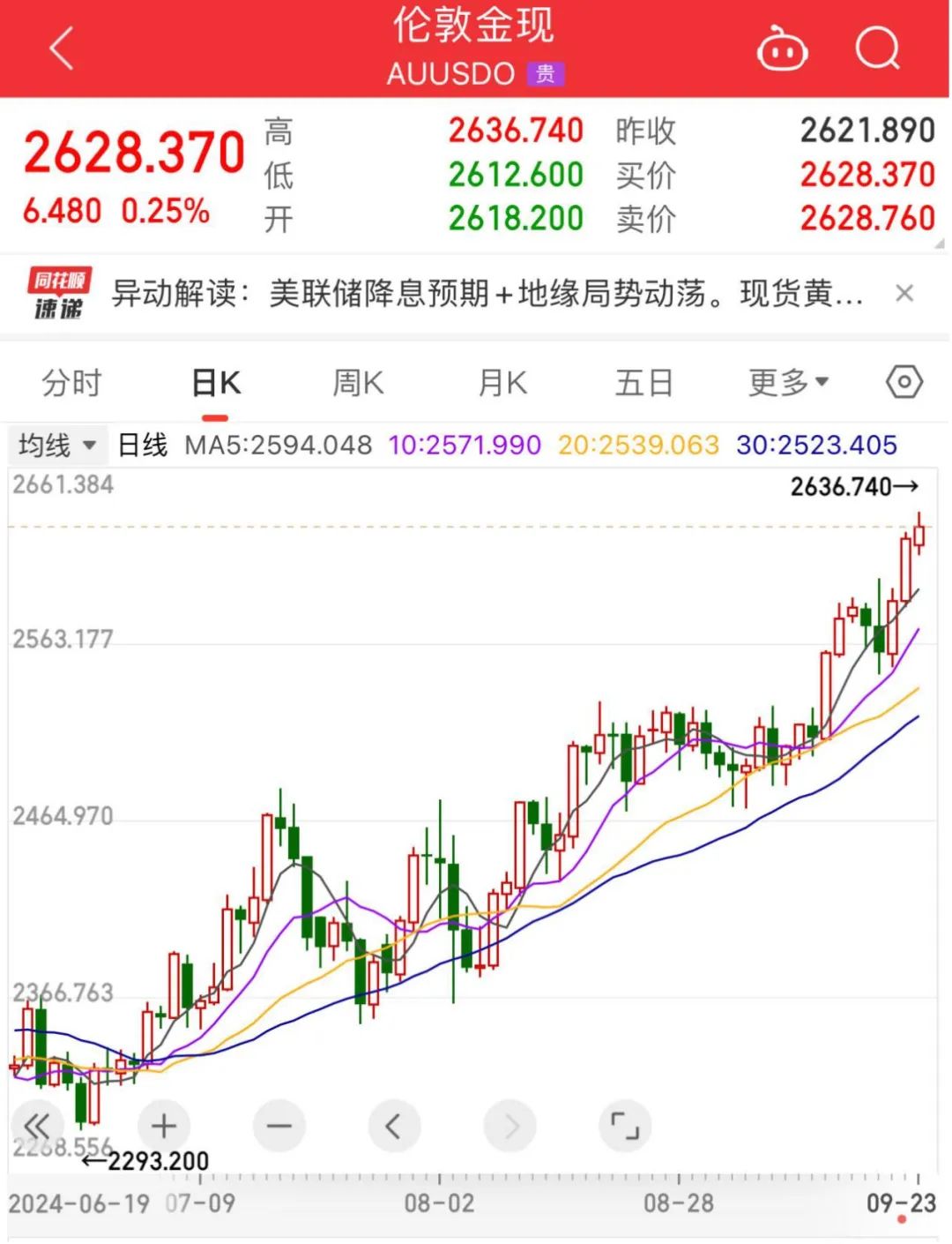 同花顺数据显示,伦敦金现(现货黄金)最攀援升至2636.74美元/盎司,再刷史乘新高。与此同时,期货商场也迎来发生,COMEX黄金期价23日涨至2659.8美元/盎司新高。