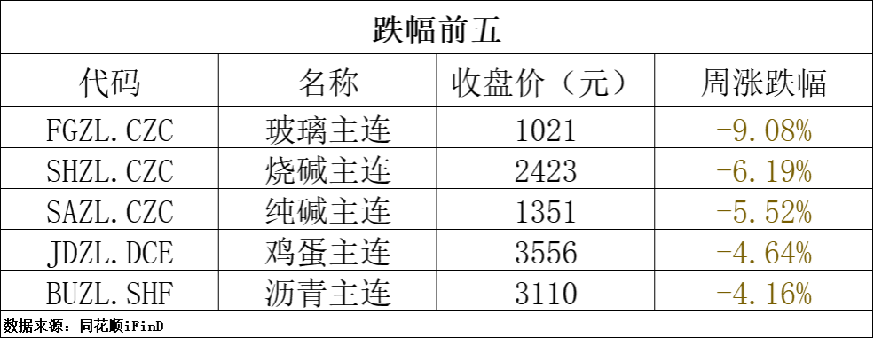 上周邦内期货主连跌幅位居前五的阔别是玻璃-9.08%、烧碱-6.19%、纯碱-5.52%、鸡蛋-4.64%、沥青-4.16%。