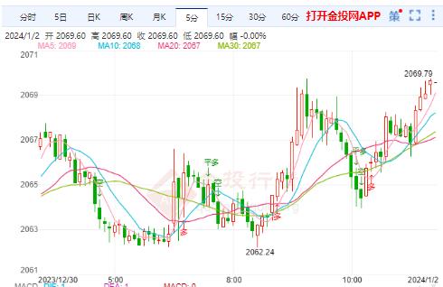 最低触及2062.24美元/盎司!黄金期货交割单位周二(1月2日)本买卖日黄金期货日内坚持颠簸,今日开盘报2062.65美元/盎司,最高触及2069.89美元/盎司,最低触及2062.24美元/盎司,截止发稿金价报2069.79美元/盎司,涨幅0.35%。