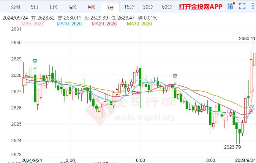 周一(9月23日)本交往日现货黄金日内支持震撼走势,今日开盘报2621.36美元/盎司,最高触及2631.31美元/盎司,最低触及2615.95美元/盎司,截止发稿金价报2626.83美元/盎司,涨幅0.18%。