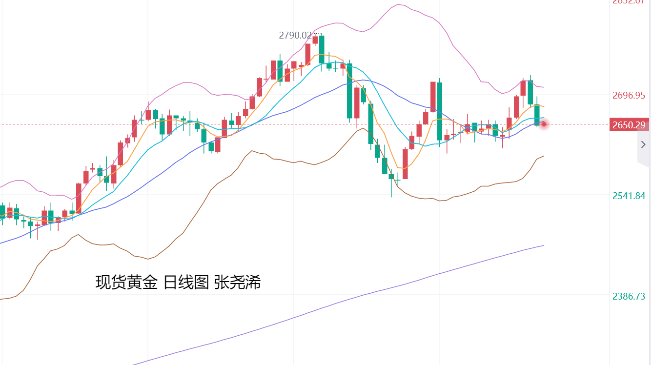 但正在周四短暂走强录失当周高点2725.73美元后,则遇阻回落转跌收阴,周五也是进一步回落走低收跌,触及日中轨左近支柱,最终收于2649.61美元,周振幅98.32美元,相关于前周收盘价2632.74美元,收涨16.87美元,涨幅0.64%;相关于当周开盘价收涨5.7美元,涨幅0.21%。