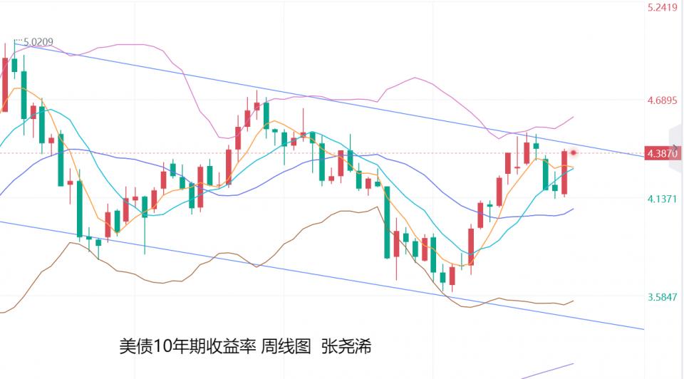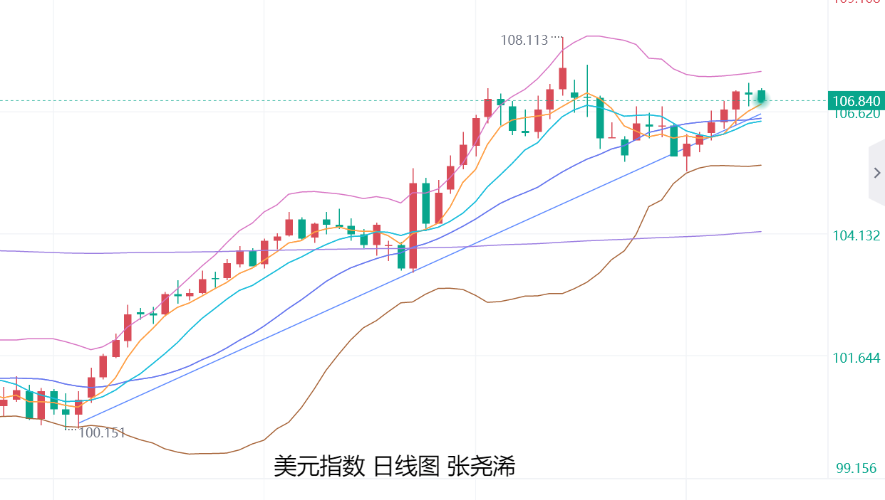 美元指数方面,日图自触及回升趋向线支柱后,不断反弹走强,目前已稳于中轨及短期均线上方,布林带也欲启齿向上,众头前景巩固,虽早盘外示走弱,但仍庇护正在看涨支柱上方,周图也重回5-10周均线支柱之上,布林带向上延迟,众头力气巩固,后市正在跌破回升趋向线周均线前,将仍以看涨为主,将会范围金价众头;