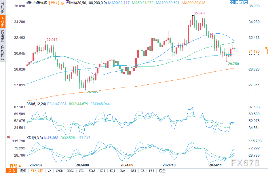 COMEX 12月白银期货空头近期满堂时间上略有上风。正在日K线图上,价钱仍呈消浸趋向。白银众头的下一个上行主意是收于坚实的时间阻力位33.00美元上方。空头的下一个下行主意是收于11月低点29.75美元的坚实撑持下方。首个阻力位睹于本周高点31.615美元,然后是32.00美元。下一个撑持位睹于隔夜低点30.89美元,然后是30.50美元。