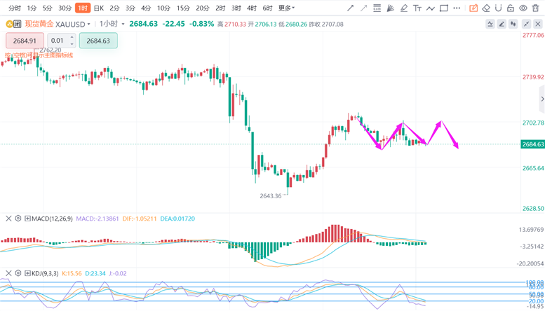 从黄金 1 小时均线情景来看,均线尚未显现拐头迹象,这意味着黄金临时未必依然劈头反转行情。纵然黄金此前的反弹看似较为强势,但本质上正在 2710 上方却几次承压回落。是以,早盘正在 2710 下方可延续拔取逢高做空,好比早盘正在 2703 的价位就能够先考试做空。正在昨天黄金强势反抽之后,此前的空头趋向临时算是告一段落了,但行情也未必就依然反转,大意率又要开启惊动行情形式了。既然行情并未反转且正在高位承压,那么咱们就延续正在高位组织空单,看其惊动回落。
