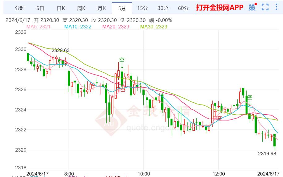 周一(6月17日)本营业日现货黄金日内维护颠簸走势,今日开盘报2330.70美元/盎司,最高触及2332.54美元/盎司,最低触及2319.56美元/盎司,截止发稿金价报2319.95美元/盎司,跌幅0.54%。