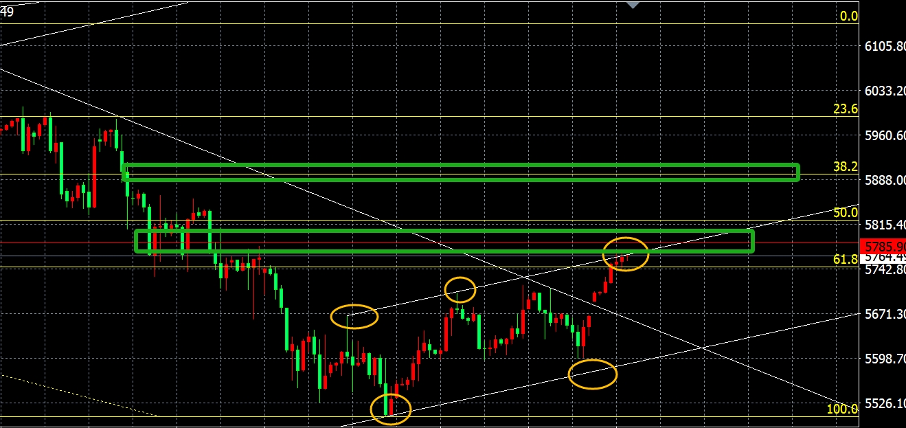 标普期货,昨天高位颤动,目前强阻力区域,即日赓续体贴冲高回落,5500以后的反弹面对调理。压力5820及5880-5900区域,冲高空为主。