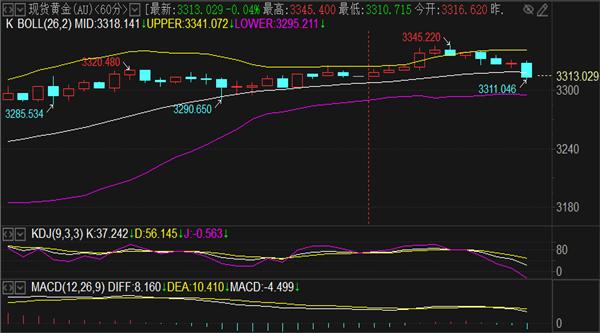 黄金及时行情剖析:周四黄金早盘高点触及3345一线小时平行通道上轨承压,太顽固了一点,念等3350职位做空,这一波错过了。盘面上来看黄金价钱照样正在1小时布林带上下轨区间盘整,上方的压力看3345-50周围,下方的支持看1小时主动平行通道中轨3308职位,1小时趋向线一线小时SAR目标于顶部展现,MACD目标顶背离信号展现,短期内走势还将会下跌摸索低位接济节点。