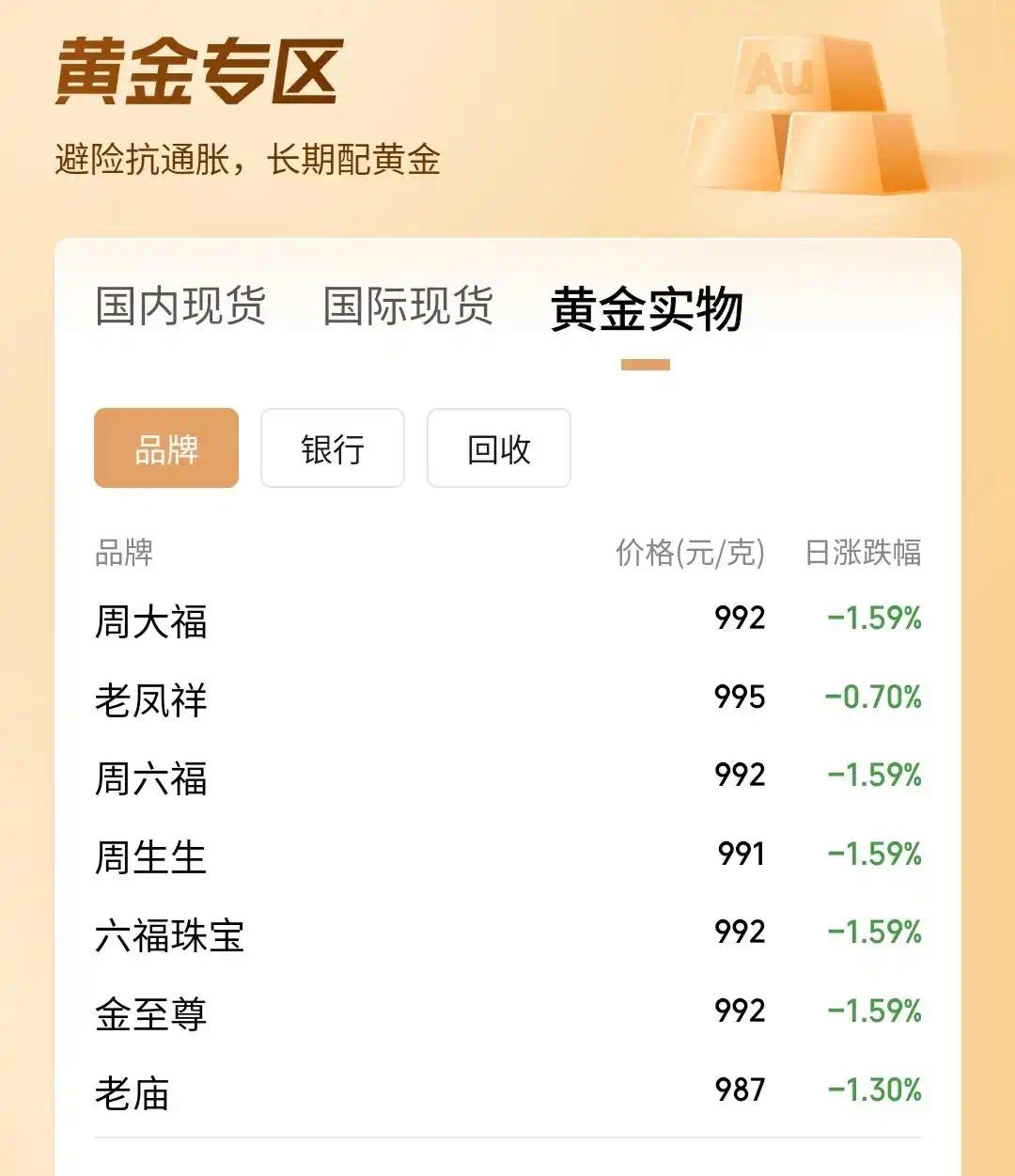 受此影响,今日,邦内众个品牌金饰价钱跌回千元以内,周大福足金饰品标价992元/克,周生生足金饰品标价991元/克,老庙足金饰品已跌至987元/克。