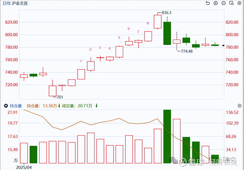 结果,基于我的窥察,对本轮的下跌做一个小的解析和预计。如前所述,就邦内市集来看,本轮率先辈场的是筑设型机构(料想为保障公司),SGE的成交数据显示这个人资金聚积成交的时期是4月初到4月11日,之后这个人筑设资金的气力就有所低落(4月12日的十字星K线仿佛也显示了这股气力的凋零),金价的决意权4月21日起头变更到投契资金的手里。那么一个或许的揣摩是, 4月12日的缠绕763元/g的十字星金价,都是筑设机构可能接纳的价钱,金价正在这个地位的掷压会分明减轻。而从身手解析的角度来看,近几天780元(较763元+2.2%)的底部掠夺激烈但牢靠。现在没有强大的根基面消息,金价又将进入一轮颠簸期,这也较量契合本轮长牛行情中的前期走势特性——由于市集也需求时期消化消息。长周期视角下,只管4月金价阅历了较大幅度的颠簸,但不影响上涨的大对象,由于美邦信用危险题目短期仍难以看到管理的迹象,而美联储降息周期仍可期,正在美元信用和现实利率两个维度上,都对金价有支柱。