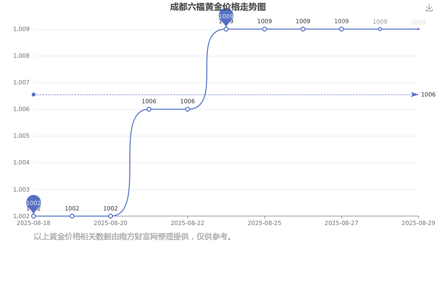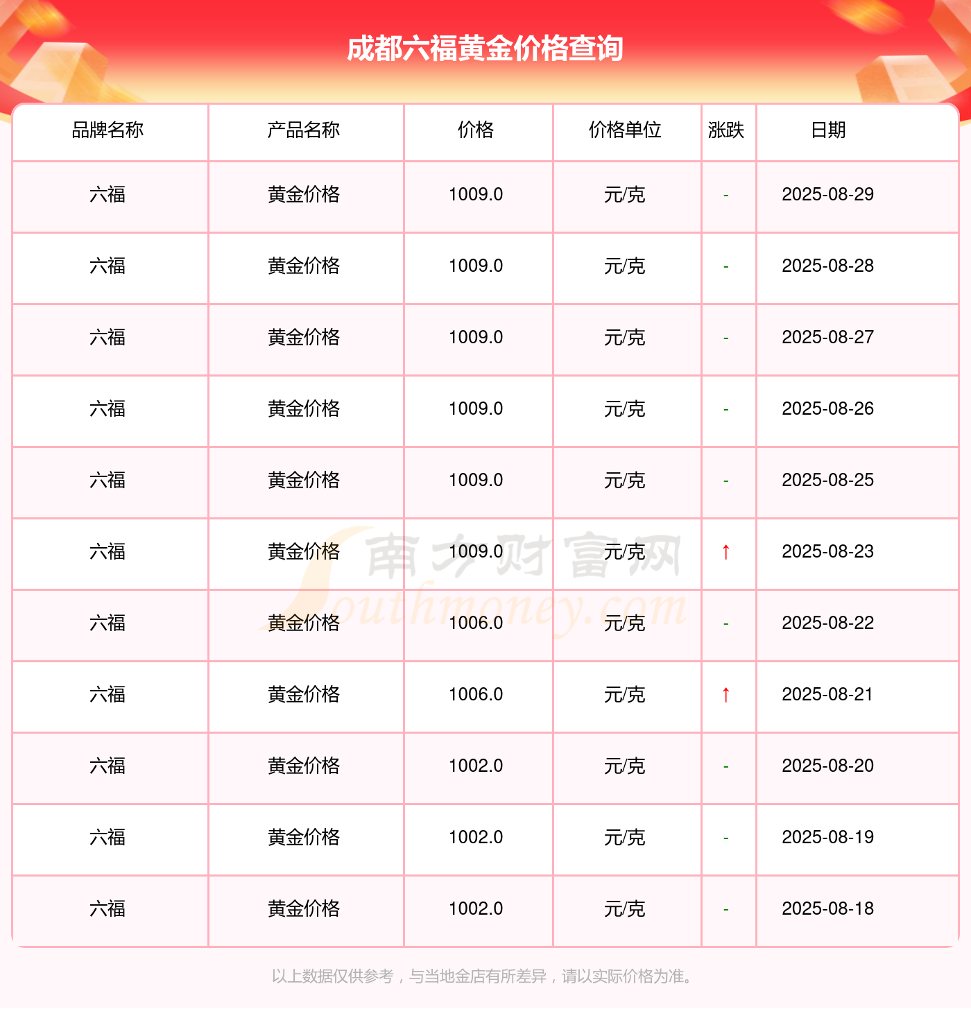 成都六福正在 2025年8月31日,黄金价值的售卖价值是 1009.0元/克。