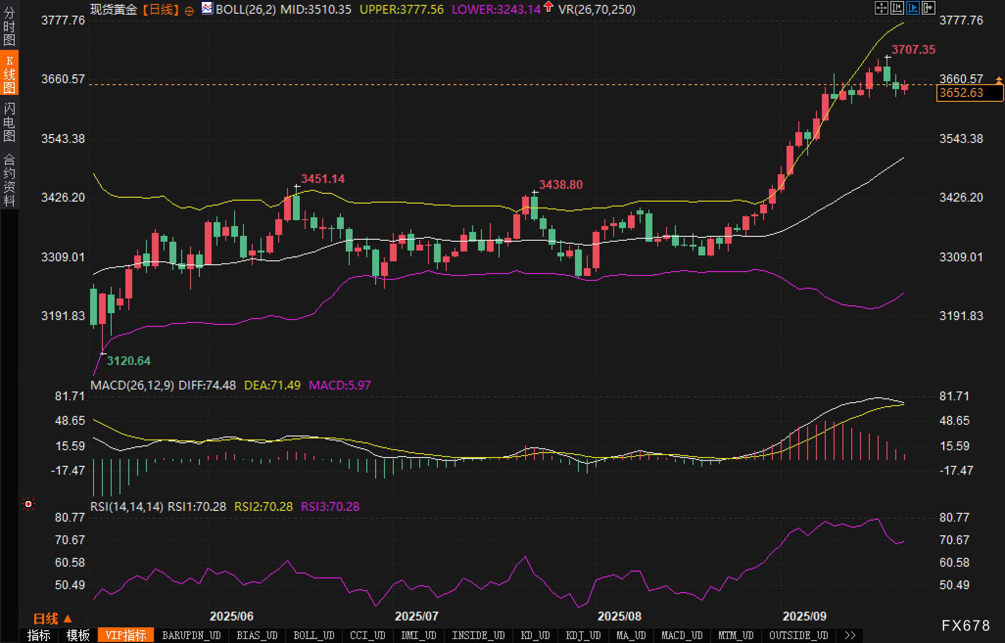 日线K线图显示,布林带上轨位于3777.56,中轨3510.35,下轨3243.14。价值自8月末起沿上轨加快,并正在3707.35处冲顶后显露两连阴回撤。全体仍运转正在布林中轨之上,高位“回测—整顿”的构造更像一次趋向中的动能换挡而非即刻的趋向反转。