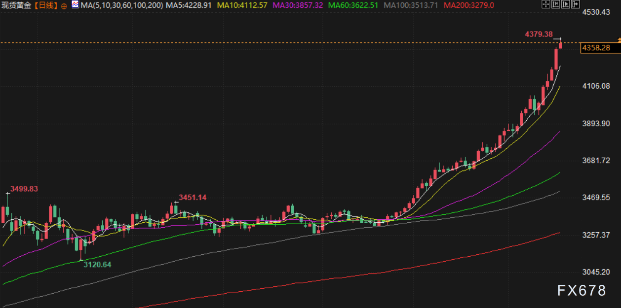 金价周四触及4379.38 美元的记录高位。美邦12月期金触及4335美元的记录新高。