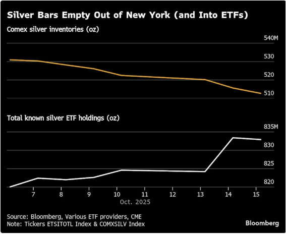 过去一周,已有逾1500万盎司白银从纽约商品生意所相干货仓被提取,估计大部门将运往伦敦以缓解供应紧急。只是,同期ETF资金净流入约1100万盎司,进一步衰弱了伦敦库存的缓冲空间。