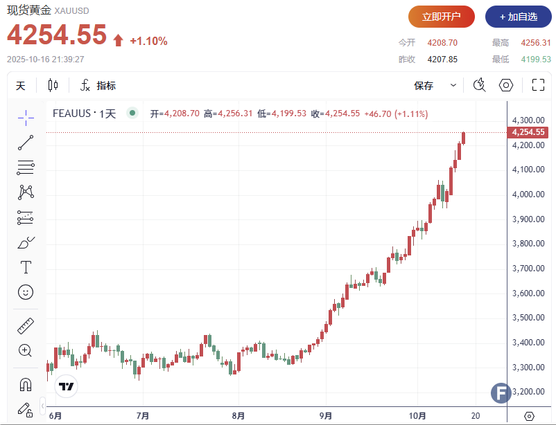 现货黄金周内累计上涨跨越5%,盘中一度打破每盎司4256.31美元,创下史籍新高,延续自8月以还的迅猛涨势。截至发稿,现报每盎司4254.55美元。