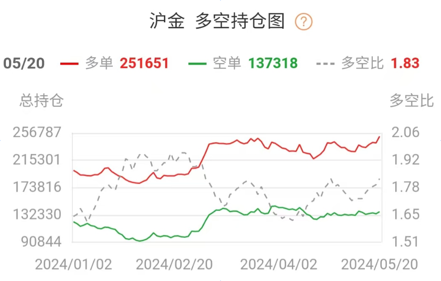 即使黄金期货最众人头近阶段依然陆接续续逢高减仓,但目前墟市做众的气氛如故较浓。据统计,2022年以还,黄金期货众单持仓量络续震撼走高,这一趋向正在本年获得了延续,本年5月20日,黄金期货众单持仓量到达了25.2万手,创出近年来的新高,且全体持仓众空比也处正在较高水准。