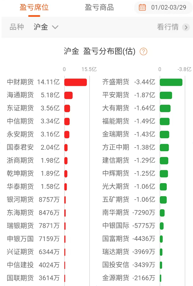 而近两年对黄金期货的果断重仓做众,也实正在让中财期货得益不菲。据东方家当期货APP测算,本年1-3月,中财期货沪金期货头寸已红利超14亿元,大幅领先其他同行。