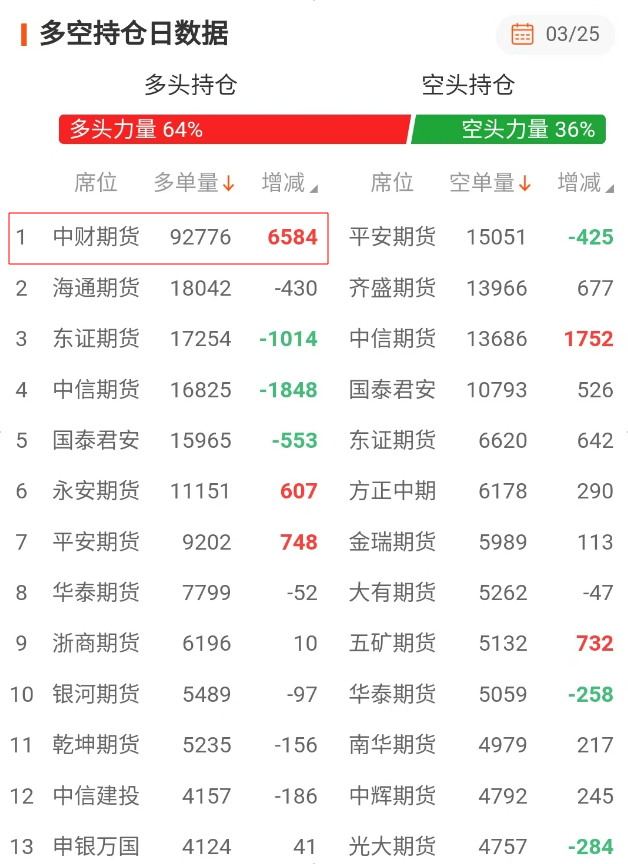 进一步来看,东方家当期货APP显示,本年内中财期货黄金众单的持仓高点闪现正在3月25日,彼时中财期货全数的黄金众头仓位曾一度一共到达9.28万手,远超排名第二的海通期货的1.8万手。只是云云的高众头仓位并没有连结太久,随后正在3月末至4月上旬的近两周时分内,中财期货就急速减仓了近3万手黄金众单。