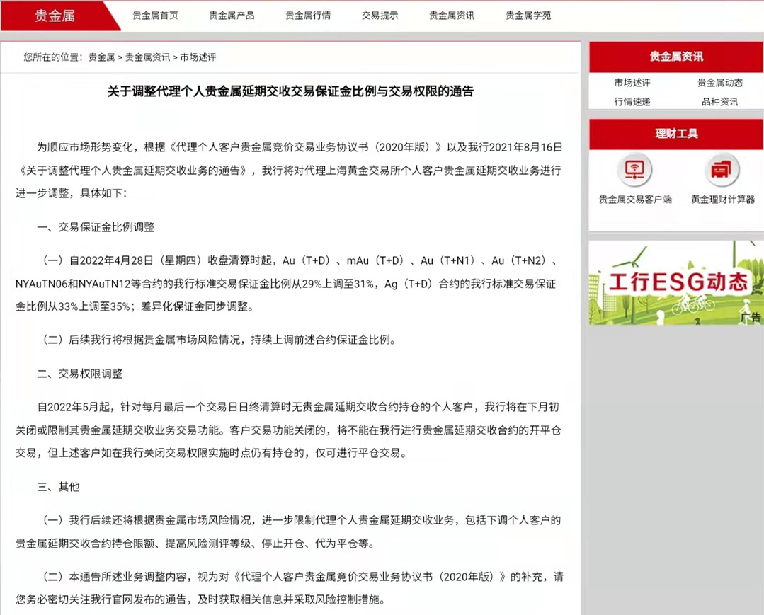 自2020年11月此后,搜罗工商银行正在内的宇宙贸易银行就对贵金属交易连接做出了一系列安排,搜罗暂停新开户、进步保障金比例、进步危机测评等第、停滞开仓、代为平仓、强制闭塞交易功用等等。