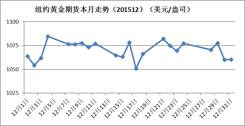 纽约商品来往所黄金迩来交割月期货12月1日收盘价为1063.8美元/盎司,12月31日收盘价为1060.3美元/盎司,月底较月初仅下跌0.33%。本月内最高点呈现正在12月4日,收盘价为1084.5美元/盎司;最低点为12月17日,收盘价为1050.8美元/盎司,创2010年头此后最低点。(详睹下图)