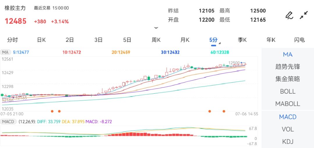 黄金期货涨为啥黄金股票不涨版权归属于原作者金投网APP行情核心数据显示,截止2023年7月6日下昼15:00收盘,橡胶期货主力合约行情音信:最新价:12485,涨跌:380,涨跌幅:3.14%,成交量:416929手,开盘价:12200,昨收价:12175,最高价:12500,最低价:12165。