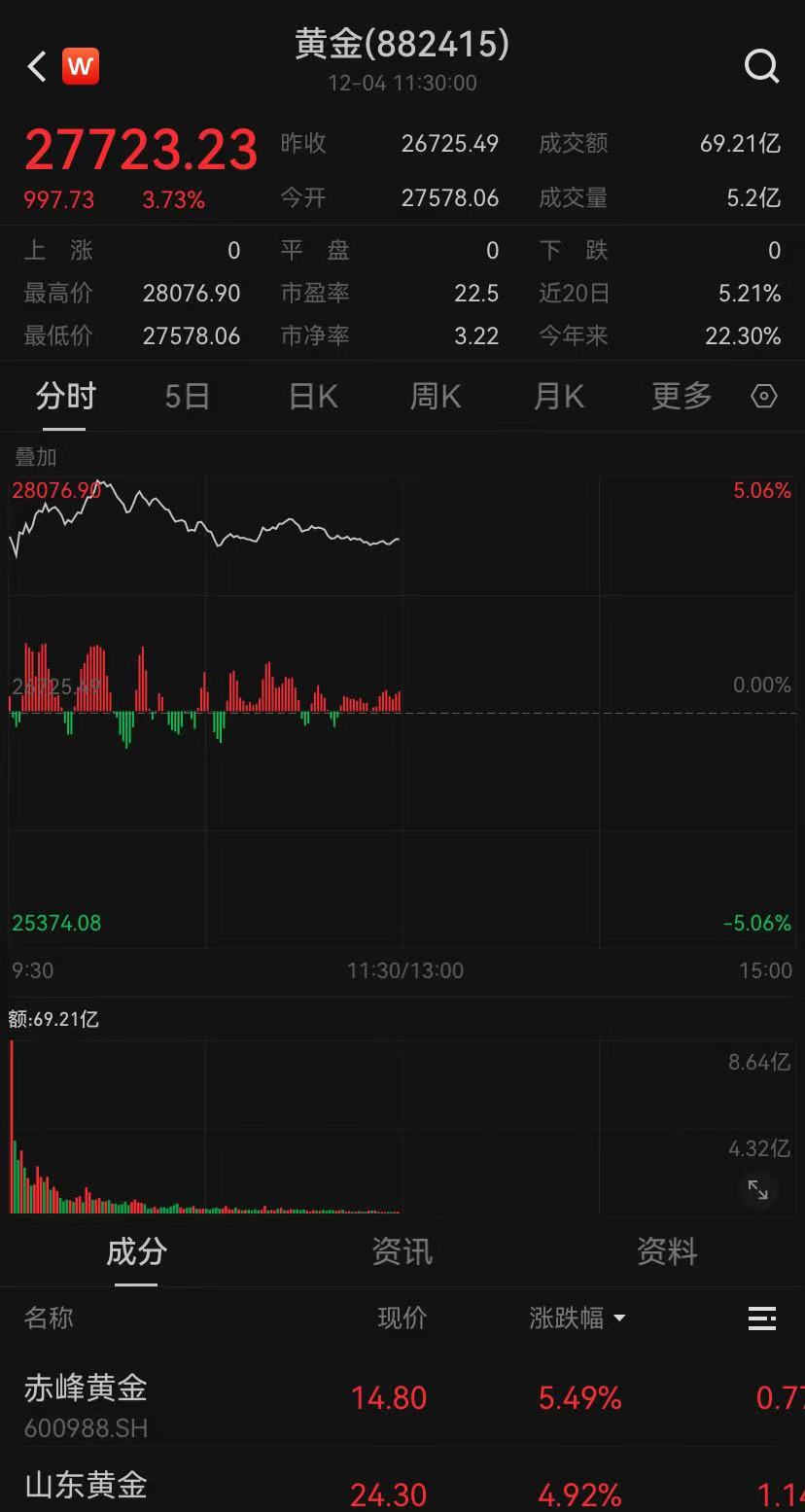 受此影响,今日开盘A股黄金股大涨,涨幅一度逾越5%,午盘回落至3.73%。个股方面,赤峰黄金(600988.SH)上涨5.49%,山东黄金(600547.SH)、玉龙股份(601028.SH)、四川黄金(001337.SZ)涨超4.8%。