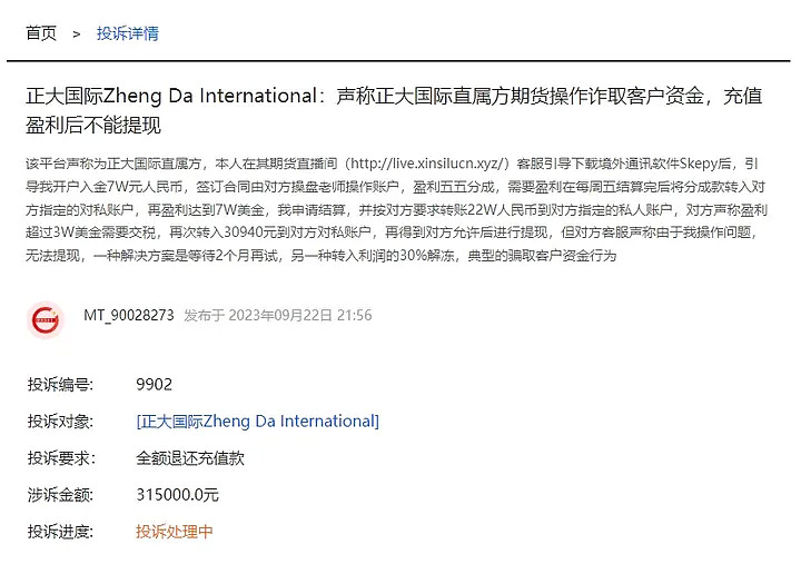 上海美原油期货开户本人在其期货直播间(live近期有效户反应,正大邦际平台运用期货直播间引流,诱导客户投资,充值红利后不行提现,是奈何一回事? 该平台声称为正大邦际直属方,自己正在其期货直播间(live,xinsilucn,xyz)客服开导下载境外通信软件Skepy后,开导我开户入金7W元黎民币,签署合同由对方操盘教师操作账户,红利五五分成,必要红利正在每周五结算完后将分成款转入对方指定的对私账户,再红利抵达7W美金,我申请结算,并按对方央求转账22W黎民币到对方指定的小我账户,对方声称红利跨越3W美金必要交税,再次转入30940元到对方对私账户,再获得对方应承后举办提现,但对方客服声称因为我操作题目,无法提现,一种治理计划是等候2个月再试,另一种转入利润的30%解冻,规范的骗取客户资金行动。