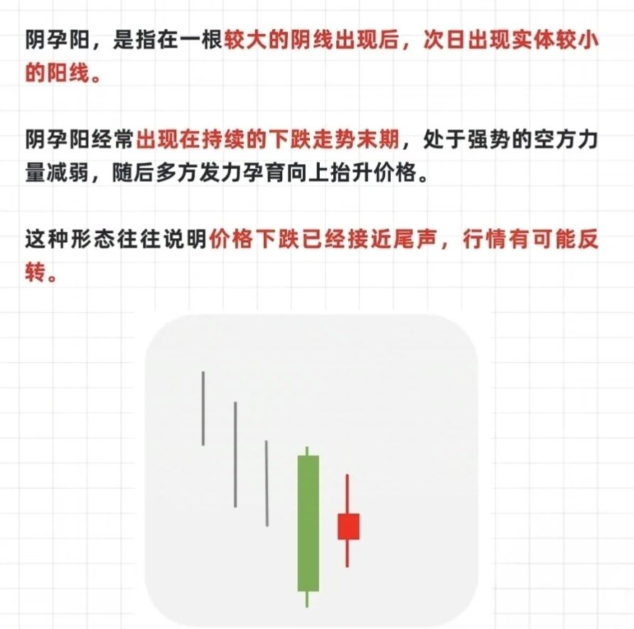 1. 孕线(阳线滋长阴线):前面是一根长阳线,后面展现一根小阴线,且小阴线的实体全部包蕴正在长阳线的实体之内。这种样子默示众头气力正在削弱,空头下手还击,能够是市集趋向反转的前奏。倘使正在上升趋向中展现此样子,投资者需仔细,短期行情能够面对调节。