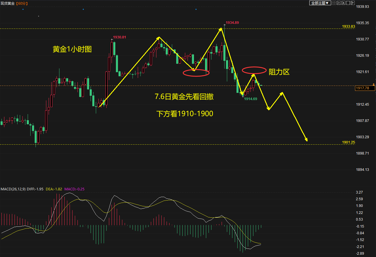 那么今日黄金基础清朗了,今日看回撤下跌行情。盘绕1900-1926之间。弱势空头会从1920以下直接回落,下方看1915-1910最远1900 04 暂定。不看大涨大跌 今日 大抵率是区间惊动 然而偏空运转 反弹空 日内往还更好。