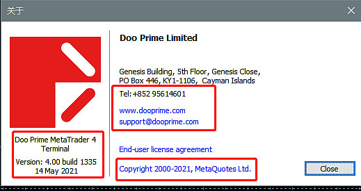最终,查看顶部“助助=闭于”内音信:全体PC版MT4都有“助助=闭于”这个窗口,首要是供应商和开采商音信。以Doo Prime 德璞资金为例,点击菜单栏的“助助”,下拉点击“闭于”,正在弹出窗口里,能够看到内里有Doo Prime 德璞资金的联络音信、网址和邮箱等,最左边有MT4的版本号,右边有迈达克软件公司供应的署名,这些蓝色的链接都可直接点击晚进入相对应的网页,而盗版的MT4不会有这么具体的音信。