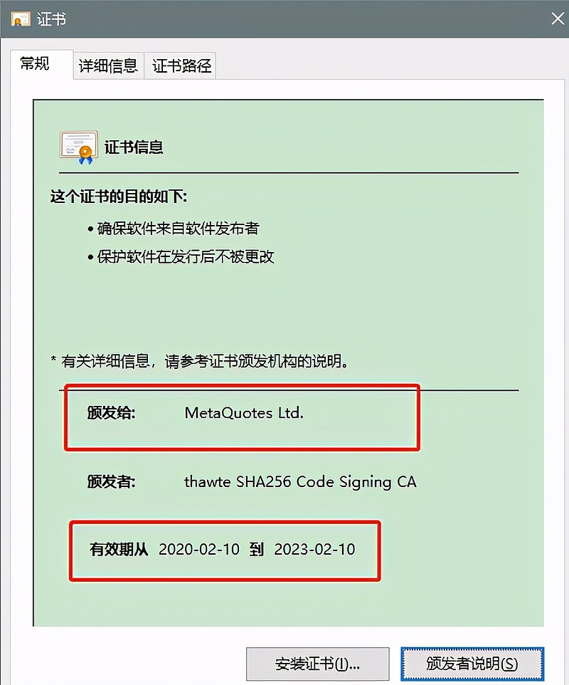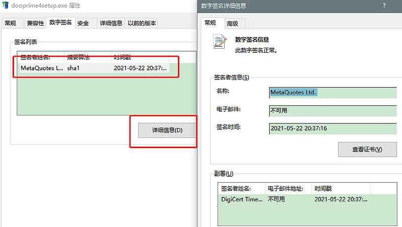 然后,需求细心软件的数字署名:同样的,正在安设包的“属性”中,选中数字署名,并点击查看详情,核实证书的署名者名称是否为“MetaQuotes Software Corp或者MetaQuotes Ltd.”