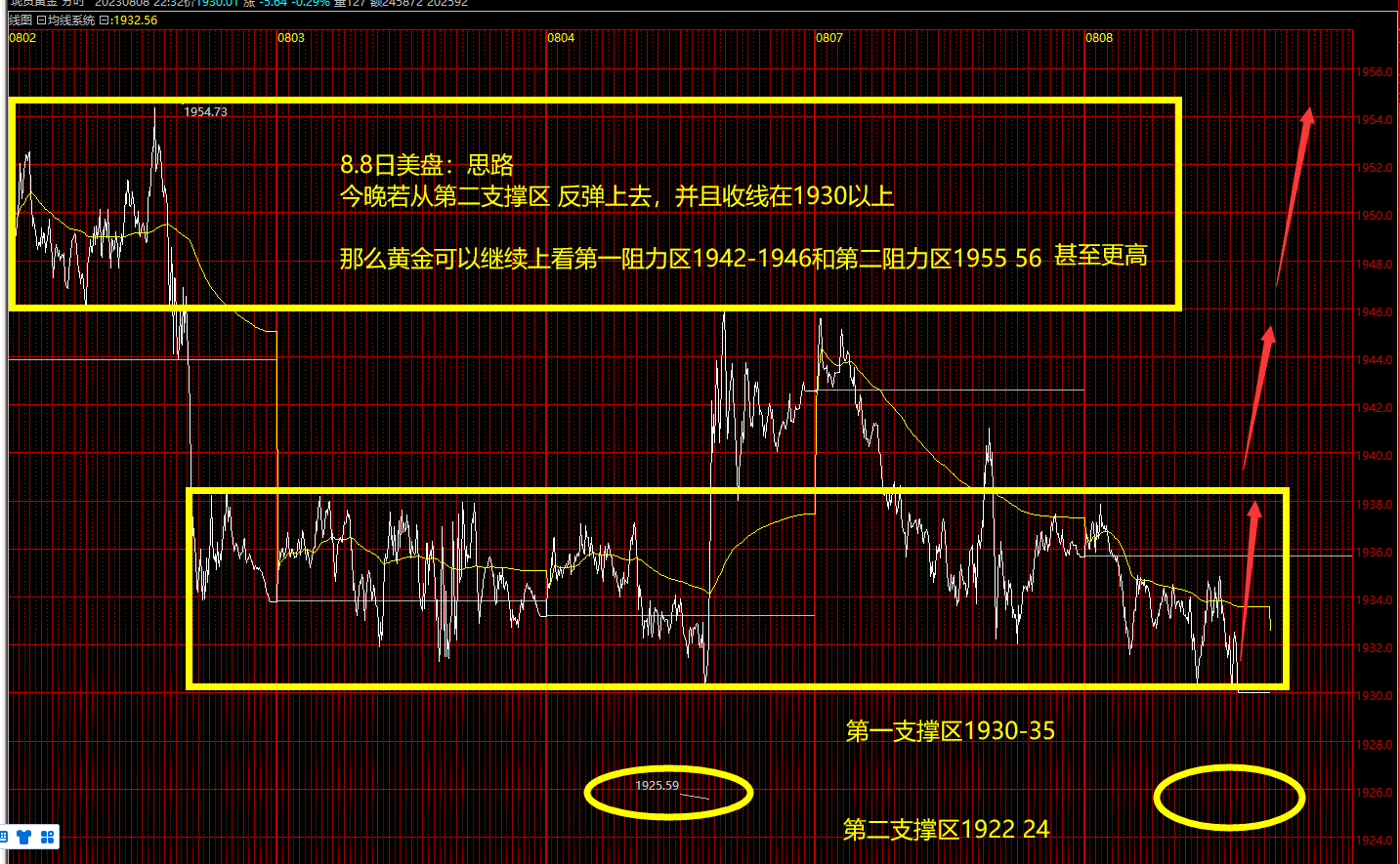 日内短线也许还会有几次,但今日黄金应当抵达低位区域了。1920-1932一带都是首要撑持区