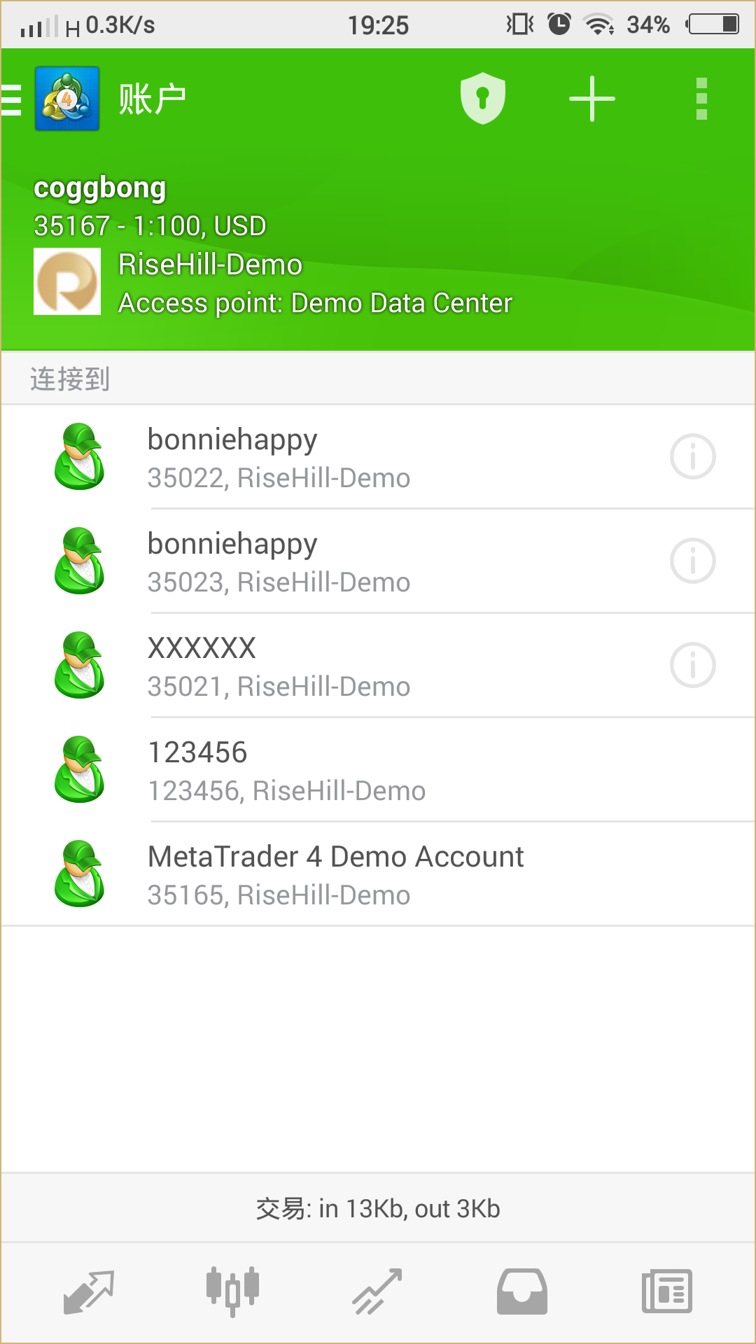 “MetaTrader 4”软件能保全众个账户。点击手机左上角,选拔“账户”。该窗口大将显示您保全的悉数账户。您可能正在念要激活的账户中自正在转换。假设您之前没有保全该账户消息,则必要从头输入账号和暗号。
