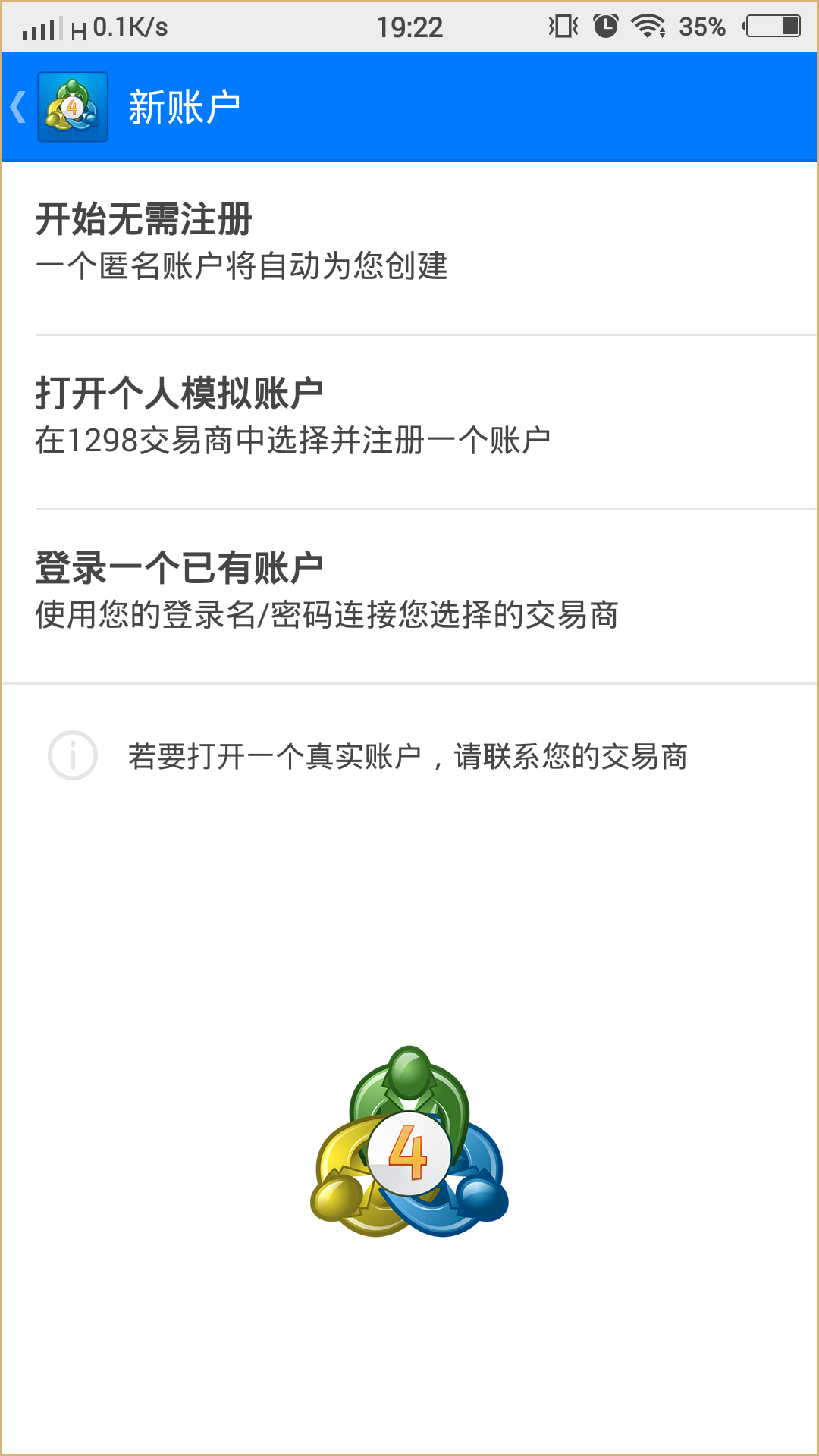 最初您务必正在您的安卓手机端下载安设“Metatrader 4”,安设后正在首页应可能看到该使用次第。点击“Metatrader 4”图标,掀开后您将看到“新账户”窗口。正在这个“新账户”窗口,您将看到两个选项:• 掀开个体模仿账户• 登录一个已有账户