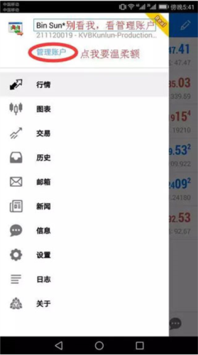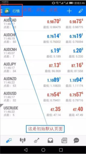 2、进入之后,能够看到这是最初的默认页面。如下图所示点击左上角行情,点那里就能够登录贸易账户了;